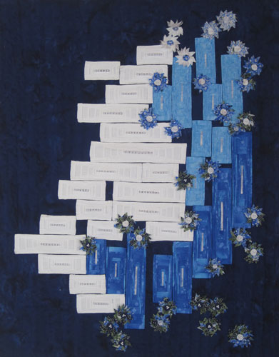 Ihre ersten Werke entstanden aus bunten Stoffen. Ab 2007 reduzierte Annemarie Sprecher die Farben in ihren Arbeiten auf blau/weiss bis hin zu weiss. In der Ausstellung zeigt Annemarie Sprecher mehrheitlich Quilts in weiss.