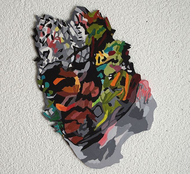 Neben Farbstiftzeichnungen, Collagen und kleinen Stickereien zeige ich in dieser Ausstellung auch Wandobjekte. Diese sind aus dünnen Sperrholzplatten ausgesägte Formen. Ein Teil dieser Holzobjekte sind freie Formerfindungen bemalt mit einfachen Farbklängen, ein anderer Teil beinhaltet Motive aus der Natur, wie Flechten, Grasbüschel, Holzstücke etc. Meine Absicht ist es, dass diese Holzobjekte unmittelbar an die Wand angebracht, wie direkt auf ihr aufgemalt wirken.