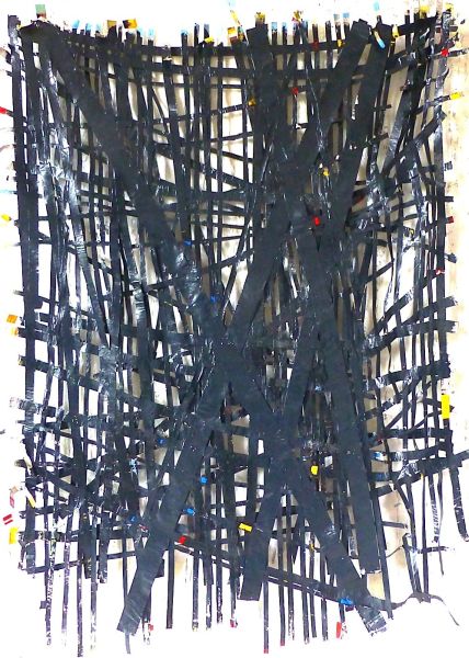 Lines and Spaces. Sie arbeitet mit Acryl und Alltagsmaterialien: Zeitungen, Klebebändern, die sie