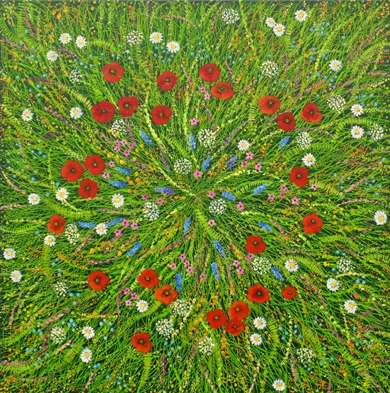 Freier, und viel mehr einer inneren Ästhetik folgend, malt Silvia Mende ihre Wälder und Wiesen, welche zusätzlich gespachtelt, gekratzt und getupft werden. Es entstehen naturnahe und doch fast surreale Bilder, der Ausstrahlung und Stimmung entsprechend auf grossen bis sehr grossen Leinwänden.