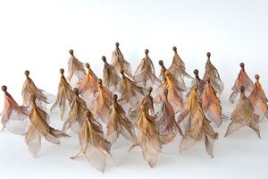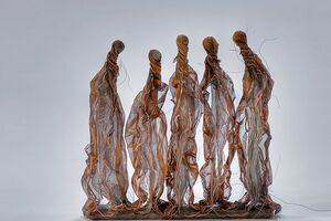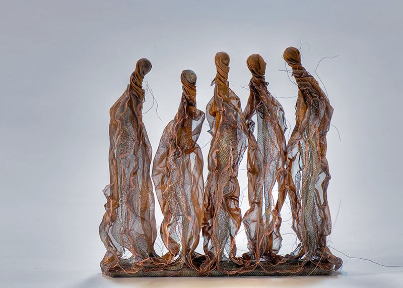 Ursula Gerber-Senger (*1958) ist eine weitgereiste und experimentierfreudige Künstlerin. 1981 begann sie während eines längeren Aufenthaltes in Venezuela als Textilgestalterin zu arbeiten. In ihren Quilts übernahm sie Elemente aus der maurischen und chinesischen Ornamentik, die sie mit freien Formen kombinierte. 1992 begann sie Wandobjekte aus Metall und Plexiglas anzufertigen. Den für die Farbflächen verwendete Seidenstoff ersetzte sie bald durch industriell gefertigtes Metallgewebe, das sie mit einem speziellen Verfahren für ihre Kunst erschloss: Sie erhitzt das Material aus Kupfer und Stahl in einem Laborschmelzofen. Auf diese Weise gelingt es ihr, eine nuancierte Palette von Farbabstufungen hervorzubringen. 1997 schuf die in der Textilkunst international anerkannte Künstlerin mit den sogenannten „Torsi“ erstmals dreidimensionale Werke aus vielschichtigem Metallgewebe.